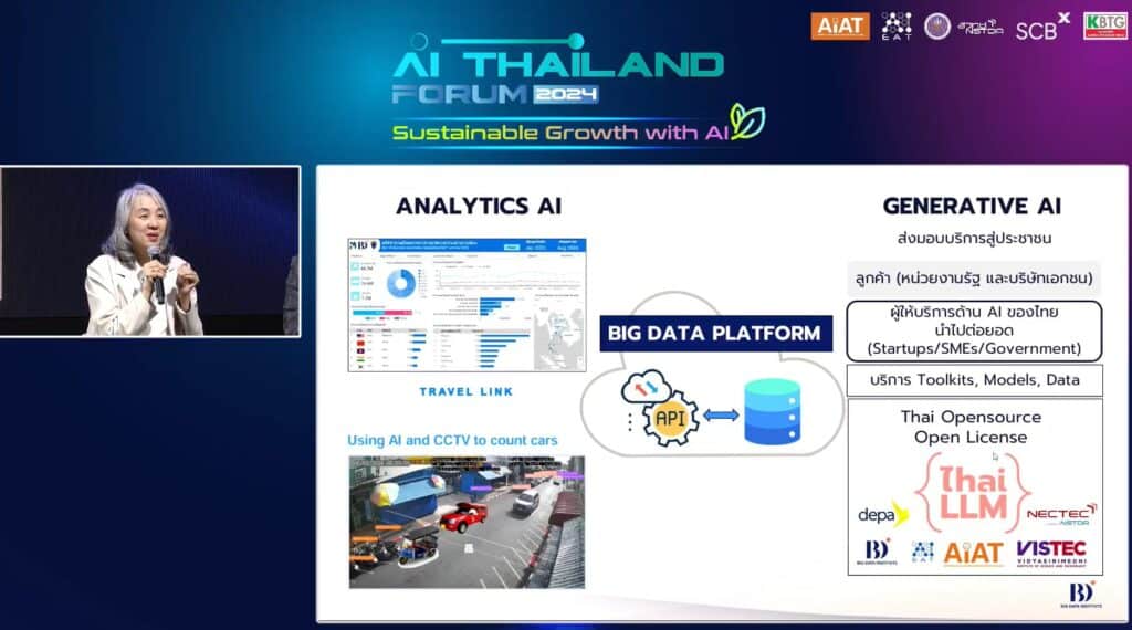ดร.สุนทรีย์ ส่งเสริม รองผู้อำนวยการสถาบันข้อมูลขนาดใหญ่ (BDI) ร่วมเวทีเสวนาหัวข้อ พัฒนา AI Ecosystem ของประเทศไทยอย่างไรให้เป็นผู้นำในภูมิภาค ในงาน AI Thailand Forum 2024 ณ สามย่านมิตรทาวน์ กรุงเทพฯ จัดโดยสมาคมผู้ประกอบการปัญญาประดิษฐ์ประเทศไทย (AIEAT) สมาคมปัญญาประดิษฐ์ประเทศไทย (AIAT) สำนักงานพัฒนาวิทยาศาสตร์และเทคโนโลยีแห่งชาติ (สวทช.) ร่วมมือกับพันธมิตรสำคัญ ได้แก่ บริษัท เอสซีบี เอกซ์ จำกัด (มหาชน) (SCBX) บริษัท กสิกร บิซิเนส เทคโนโลยี กรุ๊ป (KBTG) ซึ่งพร้อมผลักดันประเทศไทยสู่การเป็นผู้นำด้าน AI ในภูมิภาค เมื่อวันที่ 26 ตุลาคม 2567