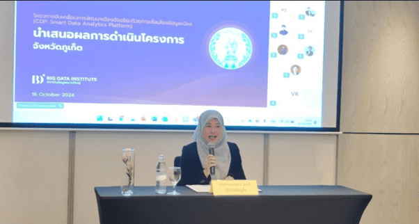 สถาบันข้อมูลขนาดใหญ่ (องค์การมหาชน) หรือ BDI หน่วยงานในสังกัด กระทรวงดิจิทัลเพื่อเศรษฐกิจและสังคม (ดีอี) นำโดย นางวรพิชญา ระเบียบโลก ผู้อำนวยการฝ่ายบริการวิเคราะห์ข้อมูล และทีมนักวิทยาศาสตร์ข้อมูล ได้เข้าร่วมการประชุมเพื่อนำเสนอผลงานและอบรมสาธิตการใช้งาน Cloud และ Dashboard ภายใต้โครงการขับเคลื่อนการพัฒนาเมืองอัจฉริยะด้วยการเชื่อมโยง บูรณาการ และวิเคราะห์ข้อมูลเมือง (CDP: Smart Data Analytics Platform) ปีงบประมาณ 2567 โดยมีผู้เข้าร่วมการอบรมจากหน่วยงานภายในจังหวัดภูเก็ต จำนวน 46 คน ณ โรงแรมคอร์ทยาร์ด แมริออท ภูเก็ต ทาวน์ จังหวัดภูเก็ต เมื่อวันที่ 16 ตุลาคม 2567