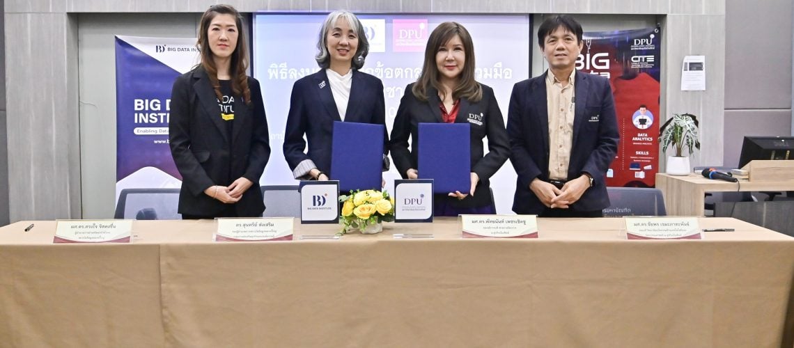 สถาบันข้อมูลขนาดใหญ่ (องค์การมหาชน) หรือ BDI โดย ดร.สุนทรีย์ ส่งเสริม รองผู้อำนวยการสถาบันข้อมูลขนาดใหญ่ กลุ่มงานส่งเสริมธุรกิจและองค์ความรู้ พร้อมด้วย ผศ.ดร.พัทธนันท์ เพชรเชิดชู รองอธิการบดีสายงานวิชาการ มหาวิทยาลัยธุรกิจบัณฑิตย์ (DPU) ร่วมลงนามบันทึกข้อตกลงความร่วมมือทางวิชาการ (MOU) โดยมี ผศ.ดร.ดวงใจ จิตคงชื่น ผู้อำนวยการฝ่ายพัฒนากำลังคน BDI, ผศ.ดร.ชัยพร เขมะภาตะพันธ์ คณบดีวิทยาลัยนวัตกรรมด้านเทคโนโลยีและวิศวกรรมศาสตร์ DPU และ ดร.ธนภัทร ฆังคะจิตร ผู้อำนวยการหลักสูตรวิศวกรรมข้อมูลขนาดใหญ่ (Big Data Engineering) DPU ร่วมเป็นสักขีพยาน ณ มหาวิทยาลัยธุรกิจบัณฑิตย์ เมื่อวันที่ 10 กรกฎาคม 2567