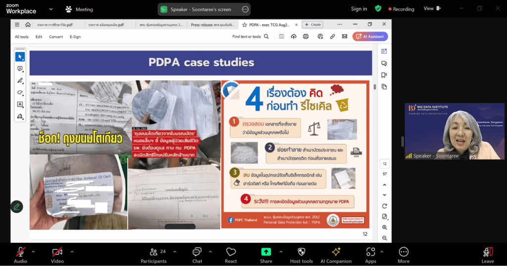 หลักสูตรที่ 2: Data Governance and PDPA for Executives ได้รับเกียรติจาก ดร.สุนทรีย์ ส่งเสริม รองผู้อำนวยการสถาบันข้อมูลขนาดใหญ่ บรรยายในหลักสูตรนี้ โดยมุ่งเน้นไปที่ผู้บริหารซึ่งมีเนื้อหาเกี่ยวกับการกำกับดูแลข้อมูลเบื้องต้น (Introduction to Data Governance) การกำหนดนโยบายและแนวปฏิบัติในการบริหารข้อมูล พร้อมกรณีศึกษา (Case Study) อีกทั้งยังมีการแนะนำเกี่ยวกับ PDPA และการประยุกต์ใช้ PDPA ในหน่วยงานรัฐและสถาบันการเงิน