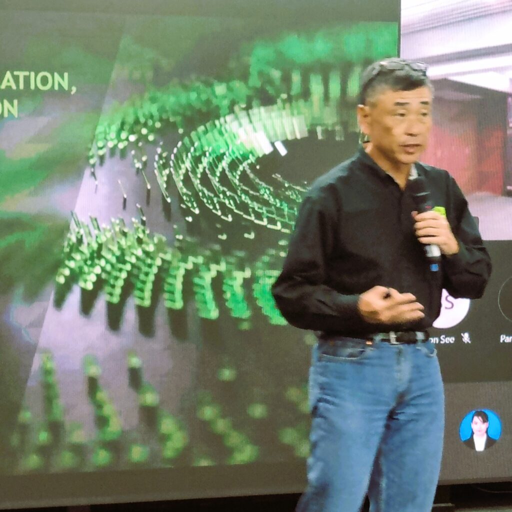 การบรรยายแบ่งออกเป็นสองส่วน โดยส่วนแรก ดร.ไซมอน ซี Senior Director and Chief Solution Architect จาก Nvidia AI Technology Center บรรยายในหัวข้อ “Industry Metaverse – Visualization, AI and High Performance Simulation” ชี้ให้เห็นถึงความสำคัญและประโยชน์ของการสร้าง Digital Twins ด้วย AI ซึ่งเป็นการจำลองสถานการณ์ หรือการสร้าง Environment จำลอง เพื่อใช้เป็นเครื่องมือสนับสนุนการทำงานในยุคปัจจุบัน ที่สามารถนำไปประยุกต์ใช้ได้อย่างหลากหลาย ไม่ว่าจะเป็นในกลุ่มธุรกิจแบบใด