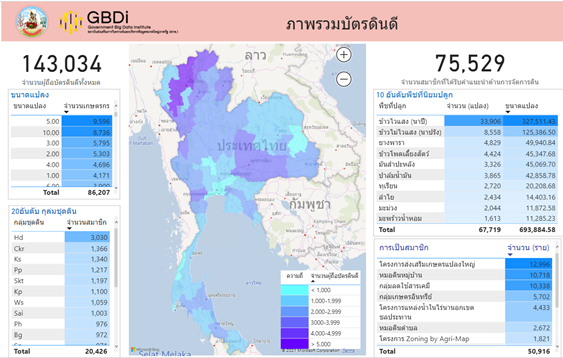 บัตรดินดี หรือชื่อเต็มๆ ว่า “โครงการบริหารจัดการดินเชิงรุกแก่เกษตรกรรายแปลงผ่านบัตรดินดี” เป็นโครงการที่มีวัตถุประสงค์เพื่อดูแลเกษตรกรผู้ถือบัตรดินดี ให้ได้รับการบริการด้านดินอย่างใกล้ชิด ประมวลผลปัญหาการเกษตรในเบื้องต้น พร้อมทั้งให้คำแนะนำการจัดการดิน โดยกรมพัฒนาที่ดินได้มีการรวบรวมคลังข้อมูลดินของเกษตรกรผู้เข้าร่วมโครงการอย่างต่อเนื่อง เพื่อให้เกิดการจัดการข้อมูลให้อยู่ในรูปแบบดิจิทัลที่มีประสิทธิภาพ ในการนี้ทางกรมพัฒนาที่ดินได้ร่วมมือกับ GBDi เพื่อเสริมสร้างการใช้ประโยชน์และวิเคราะห์ข้อมูลที่เกี่ยวข้องในรูปแบบของ Dashboard เพื่อให้เข้าใจลักษณะข้อมูลของโครงการดังกล่าว และสามารถนำข้อมูลเชิงลึกที่ได้จากการวิเคราะห์ไปประยุกต์ใช้สำหรับการวางแผน ต่อยอดให้เกิดประโยชน์สูงสุดแก่เกษตรกรและหน่วยงานที่เกี่ยวข้อง ข้อมูลเพิ่มเติมหรือสนใจสมัครสมาชิกบัตรดินดี
