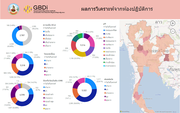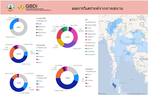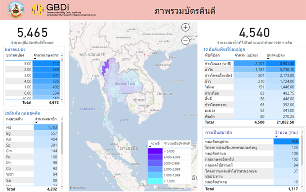ในเบื้องต้นทางกรมพัฒนาที่ดินได้ส่งชุดข้อมูลจำนวน 143,034 ราย เพื่อนำมาวิเคราะห์ในด้านต่าง ๆ ไม่ว่าจะเป็นเรื่องของภาพรวมของผู้ถือบัตรดินดี รูปที่ 1 แสดง Dashboard ที่ทำให้เราสามารถสรุปได้ว่าพื้นที่ที่สนใจมีจำนวนสมาชิกผู้ถือบัตรดินดี และจำนวนสมาชิกที่ได้รับคำแนะนำด้านการจัดการดินเป็นจำนวนเท่าใด กระจายในพื้นที่ใดบ้าง พืชที่นิยมปลูก 10 อันดับแรกคือพืชชนิดใดบ้าง รวมถึงมีการแสดงขนาดแปลง และกลุ่มชุดดิน รวมทั้งมีการแสดงจำนวนการเป็นสมาชิกโครงการอื่น ๆ ของสมาชิกผู้ถือบัตรดินดี นอกจากนี้ยังสามารถดูรายละเอียดแต่ละพื้นที่โดยเลือกพื้นที่จังหวัดที่ต้องการในแผนที่ได้ดังรูปที่ 2 ซึ่งเป็นข้อมูลบัตรดินดีในพื้นที่จังหวัดเชียงใหม่ หน้าจอการแสดงผลอื่น ๆ ก็จะแสดงผลที่สอดคล้องกับพื้นที่ที่เลือก