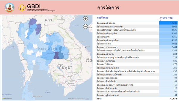 ในส่วนของการจัดการที่มีการดำเนินการสามารถสรุปในแต่ละพื้นที่จังหวัดดังรูปที่ 3 จากข้อมูลที่ได้มีการรวบรวมมานั้น การปลูกพืชปุ๋ยสดเป็นวิธีการจัดการที่มีการใช้มากที่สุด รองลงมาคือการไถพรวนตามแนวระดับ และการสร้างบ่อน้ำในไร่นา/สระน้ำ/บ่อเก็บน้ำ ตามลำดับ จังหวัดที่มีการใช้วิธีการจัดการมากที่สุด 3 อันดับแรก ได้แก่ สุรินทร์ เชียงราย และ น่าน ตามลำดับ นอกจากนี้ยังสามารถเลือกดูข้อมูลจากวิธีการจัดการได้ โดยเลือกวิธีการจากตารางด้านขวา เพื่อดูว่า การจัดการดังกล่าวพบในจังหวัดต่าง ๆ เท่าไร ตัวอย่างเช่น จังหวัดที่มีการปลูกพืชปุ๋ยสด 3 อันดับแรก ได้แก่ สุรินทร์ เชียงราย และนครราชสีมา ตามลำดับ