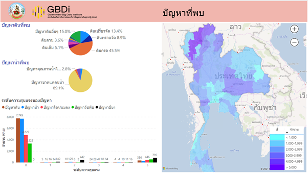 รูปที่ 4 แสดงปัญหาที่พบในแต่ละจังหวัด โดยแบ่งเป็น 2 ส่วนหลัก ได้แก่ ปัญหาดิน และปัญหาน้ำ พบว่า ปัญหาดินที่เกิดมากที่สุดคือดินกรดที่มีการพบสูงถึงกว่า 46% ส่วนปัญหาน้ำที่พบมากที่สุดคือปัญหาขาดแคลนน้ำ นอกจากนี้ยังสามารถดูปัญหาดินและปัญหาน้ำที่พบในแต่ละจังหวัดโดยเลือกจังหวัดในแผนที่ แผนภูมิรูปวงกลมจะถูกปรับให้สอดคล้องกับจังหวัดที่เลือก