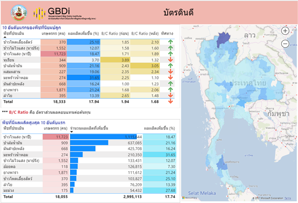 Dashboard นี้จะช่วยให้เราเห็นมุมมองเชิงลึกของชุดข้อมูล และนำไปสู่การใช้ข้อมูลเป็นส่วนช่วยในการตัดสินใจเพื่อให้เกิดประโยชน์สูงสุดตามเป้าหมายในการพัฒนาชีวิตและความเป็นอยู่ของเกษตรกรโดยใช้ Big Data เข้ามามีส่วนช่วยในการจัดการ ในอนาคตคาดว่าจะเพิ่มส่วนของการวิเคราะห์แนวโน้มและปัจจัยเพื่อให้สามารถทำนายผลผลิตในอนาคตจากฐานข้อมูลที่มีอยู่ได้