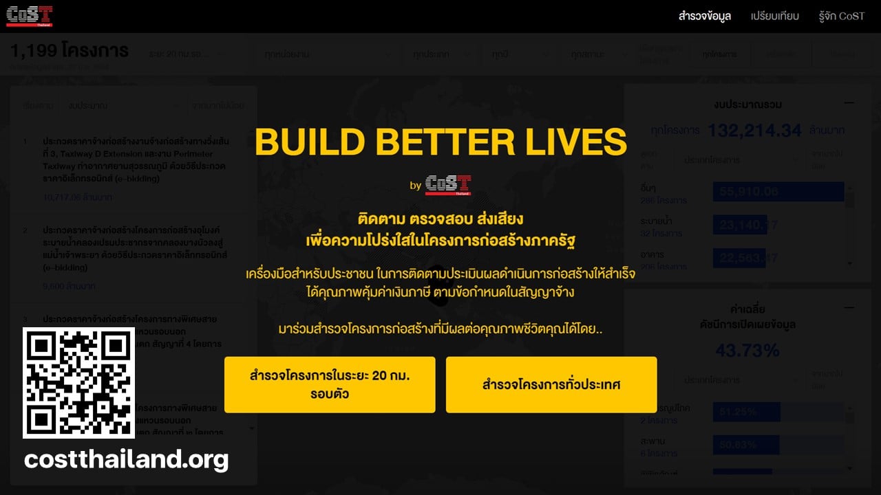 โครงการก่อสร้างภาครัฐภายใต้โครงการ CoST Thailand ในชื่อ “BUILD BETTER LIVES by CoST (https://costthailand.org)” ที่มุ่งเน้นเรื่องการเปิดเผยข้อมูลโครงการก่อสร้างภาครัฐ เพื่อสร้างความโปร่งใส และการมีส่วนร่วมของประชาชนที่ประสบความสำเร็จมาแล้วในหลายประเทศ เช่น เอธิโอเปีย ฮอนดูรัส กัวเตมาลา และประเทศไทยเอง หลังจากที่มีโครงการก่อสร้างภาครัฐเข้าร่วม CoST แล้วกว่า 1,400 โครงการ ทำให้สามารถประหยัดงบประมาณไปได้ถึง 123,626.31 ล้านบาท (*คิดจากส่วนต่างระหว่างงบประมาณรวมและมูลค่าสัญญา) จากการที่ตัวแทนภาคประชาชนสามารถสะท้อนความเห็นและทำงานร่วมกับภาครัฐหลังจากที่ได้เห็นข้อมูลงบประมาณที่ภาครัฐวางแผนดำเนินการ