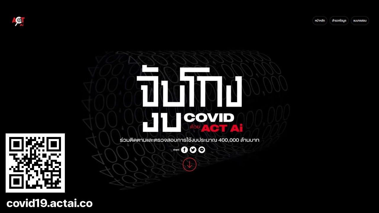 นอกจากนี้เรายังเพิ่มเครื่องมือ Data visualization ในประเด็นต่าง ๆ ทางสังคม ร่วมกับทีม Punch UP เช่น ข้อมูลงบประมาณ และเงินกู้โควิด ในชื่อ “จับโกงงบโควิดด้วย ACT Ai” (https://covid19.actai.co) ที่ต้องขอชื่นชมการเปิดเผยข้อมูลของสภาพัฒน์ฯ ที่ทำข้อมูลออกมาได้ค่อนข้างดี ทำให้สามารถนำข้อมูลมาจัดการต่อได้ง่าย นำเสนอข้อมูลในรูปแบบแผนที่ และมีการวิเคราะห์ความเสี่ยงการทุจริตในขั้นตอนการดำเนินการต่าง ๆ ข้อมูล
