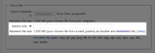 upload_by_url right, you'll see an additional input box on Special:Upload for selecting the upload source.Users with the upload_by_url right (all registered users), can directly transfer images from whitelisted websites via the API or via Special:Upload. With the Upload Wizard it is possible to upload files from Flickr. With the Video2commons tool you can upload videos and audio files by url.