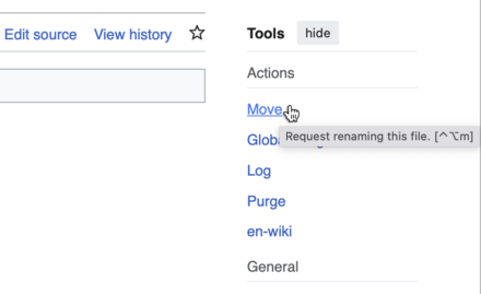 - MediaWiki:Gadget-RenameLink.js – the link on file pages in the action menu