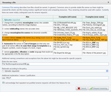 This gadget offers a simple interface for adding {{Rename}} to the file description page. It doesn't slow down (notably) loading of file pages since the heavy code is loaded only on clicking the link. It was added to the gadget's definitions after some Village Pump announcements.