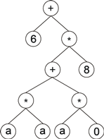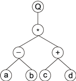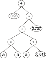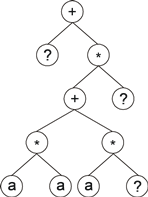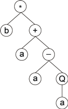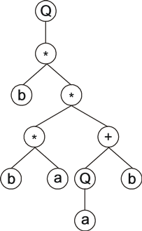 is composed of two different terminals (the variables “a” and “b”), two different functions of two arguments (“*” and “+”), and a function of one argument (“Q”). Its expression gives: