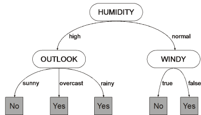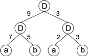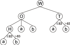 where “H” represents the attribute Humidity, “O” the attribute Outlook, “W” represents Windy, and “a” and “b” the class labels "Yes" and "No" respectively. Note that the edges connecting the nodes are properties of the data, specifying the type and number of branches of each attribute, and therefore don't have to be encoded.