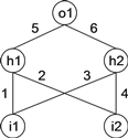 For example, below is shown a neural network with two input units (i1 and i2), two hidden units (h1 and h2), and one output unit (o1). It has a total of six connections with six corresponding weights represented by the numerals 1–6 (for simplicity, the thresholds are all equal to 1 and are omitted):