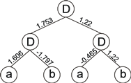 In this system, every node in the head, irrespective of its type (numeric attribute, nominal attribute, or terminal), has associated with it a random numerical constant, which for simplicity in the example above is represented by a numeral 0–9. These random numerical constants are encoded in the Dc domain and their expression follows a very simple scheme: from top to bottom and from left to right, the elements in Dc are assigned one-by-one to the elements in the decision tree. So, for the following array of RNCs: