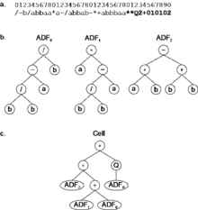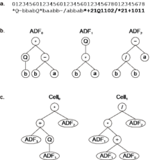 [edit]Homeotic genes have exactly the same kind of structural organization as normal genes and they are built using an identical process. They also contain a head domain and a tail domain, with the difference that the heads contain now linking functions and a special kind of terminals – genic terminals – that represent the normal genes. The expression of the normal genes results as usual in different sub-ETs, which in the cellular system are called ADFs (automatically defined functions). As for the tails, they contain only genic terminals, that is, derived features generated on the fly by the algorithm.