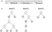 where h is the head's length and nmax is maximum arity. For example, for a gene created using the set of functions F = {Q, +, −, ∗, /} and the set of terminals T = {a, b}, nmax = 2. And if we choose a head length of 15, then t = 15 (2–1) + 1 = 16, which gives a gene length g of 15 + 16 = 31. The randomly generated string below is an example of one such gene: