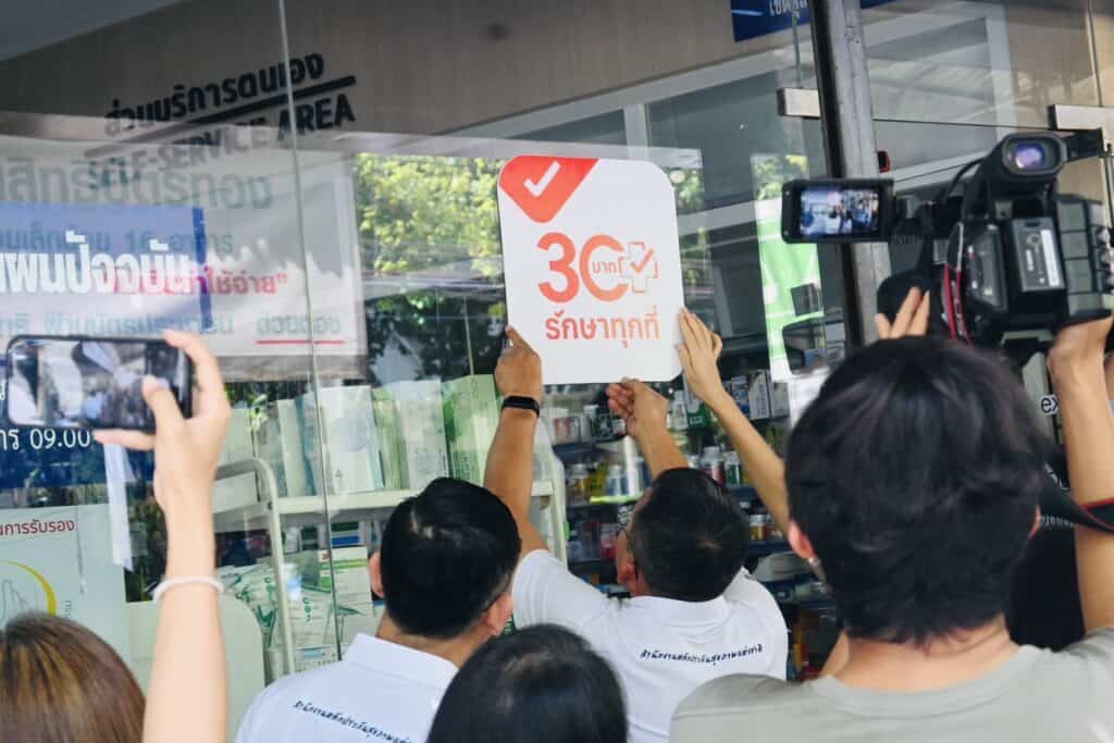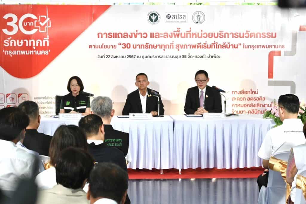 โดยมีนายสมศักดิ์ เทพสุทิน รัฐมนตรีว่าการกระทรวงสาธารณสุข พร้อมด้วย นพ.โอภาส การย์กวินพงศ์ ปลัดกระทรวงสาธารสุข รศ. ดร.ทวิดา กมลเวชช รองผู้ว่าราชการกรุงเทพมหานคร และ นพ.จเด็จ ธรรมธัชอารี เลขาธิการสำนักงานหลักประกันสุขภาพแห่งชาติ ร่วมแถลงข่าวในครั้งนี้ พร้อมประเดิมติดโลโก้ใหม่ “30 บาทรักษาทุกที่” ณ จุดให้บริการร้านยาคุณภาพ