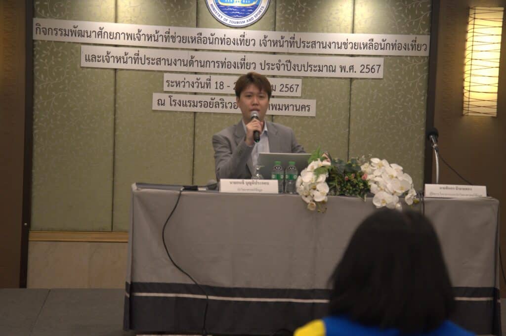 ด้านนายกนธี บุญมีประกอบ นักวิทยาศาสตร์ข้อมูล ฝ่ายบริการวิเคราะห์ข้อมูล บรรยายการใช้งาน Generative AI มาปรับใช้ปฏิบัติงานช่วยเหลือนักท่องเที่ยว โดยมีวัตถุประสงค์เพื่อให้เข้าใจความสามารถและข้อจำกัดของเทคโนโลยี ตัวอย่าง Use Cases การใช้งานที่เกี่ยวข้องกับงานที่ต้องทำ และในช่วงท้ายผู้เข้าร่วมอบรมได้ลองทำจริง เพื่อให้เห็นศักยภาพในการช่วยงานอย่างชัดเจนที่สุด โดยมีผู้แทนนักวิทยาศาสตร์ข้อมูล BDI ได้ให้คำแนะนำอย่างใกล้ชิด