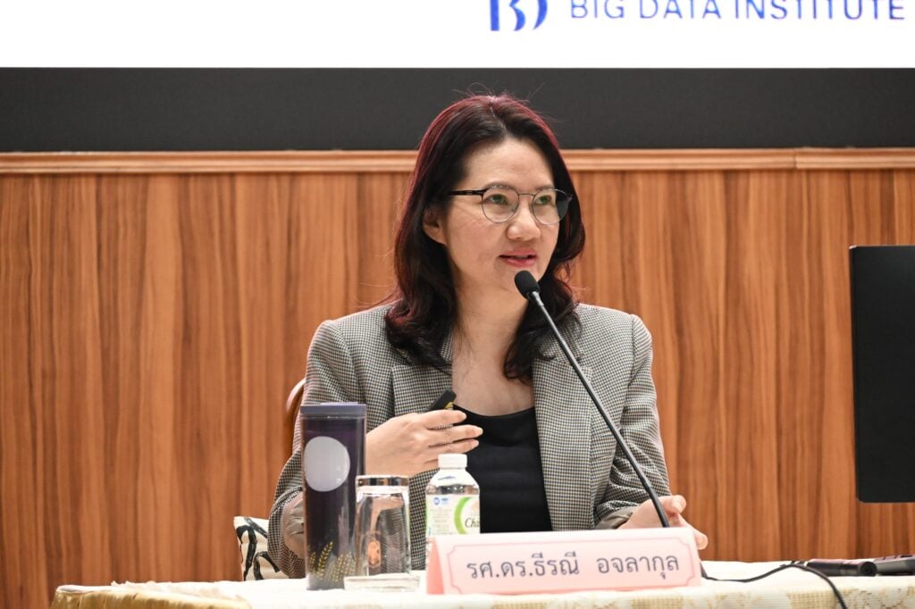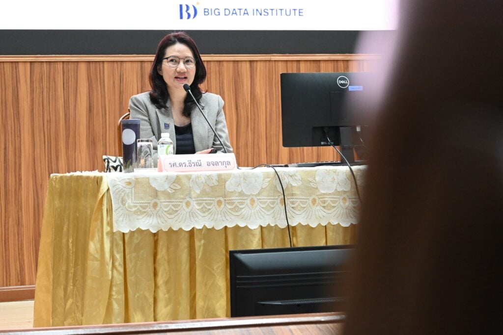 รศ. ดร.ธีรณี กล่าวว่า ยุคนี้ผู้บริหารระดับสูง ไม่อาจปฏิเสธความสำคัญของเทคโนโลยีปัญญาประดิษฐ์ (Artificial Intelligence: Al) ซึ่งแบ่งออกเป็น 3 ระดับ คือ Narrow, General และ Super โดยปัจจุบันในประเทศไทยมีการใช้ระบบ AI กันอย่างแพร่หลายอย่าง ChatGPT, Gemini และ Claude ทั้งนี้ ในส่วนของ BDI กำลังพัฒนา Thai Large Language Model (ThaiLLM) เพื่อเป็น “โครงสร้างพื้นฐานปัญญาประดิษฐ์สำหรับภาษาไทย” มุ่งสร้างความมั่นคงด้านภาษาไทย โดยร่วมมือกับพันธมิตรจากทุกภาคส่วน